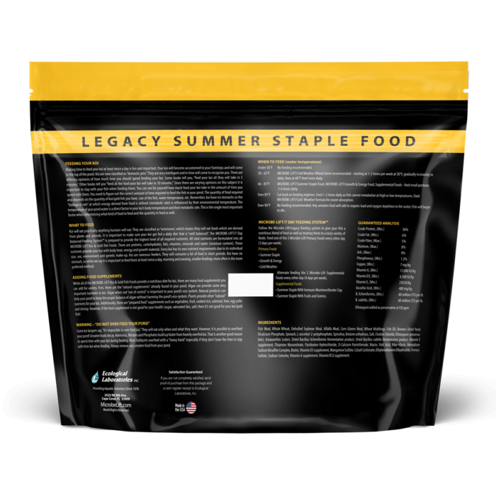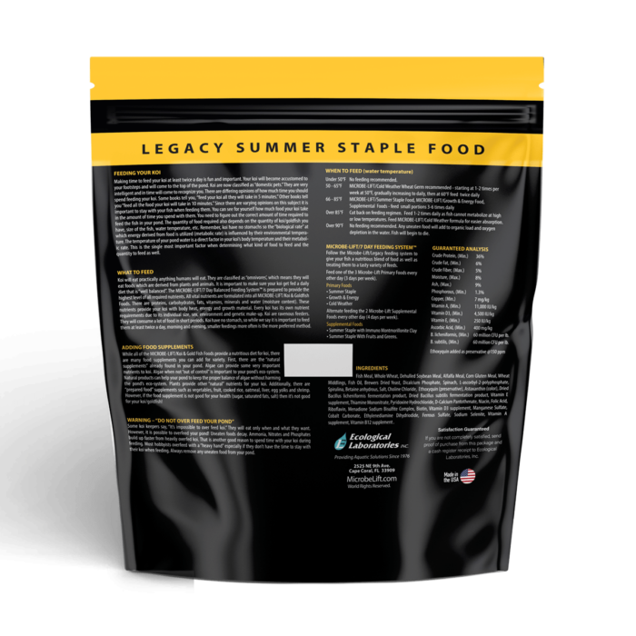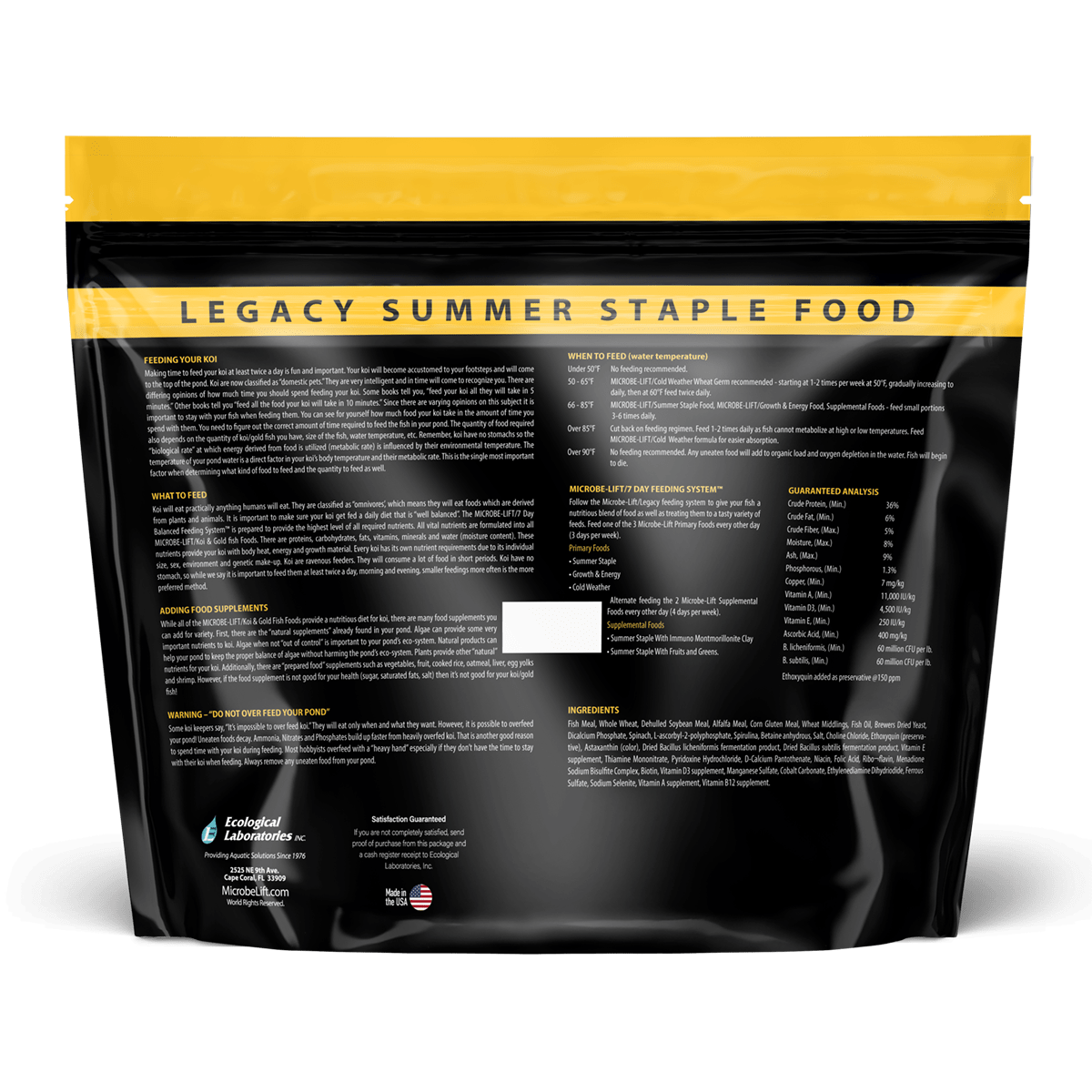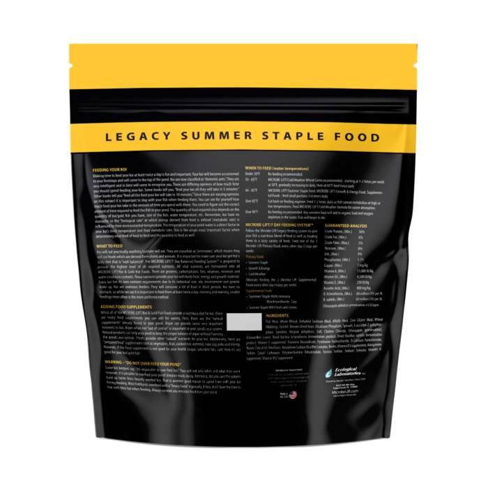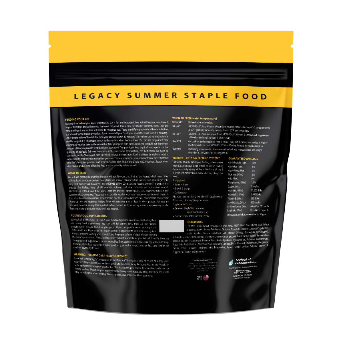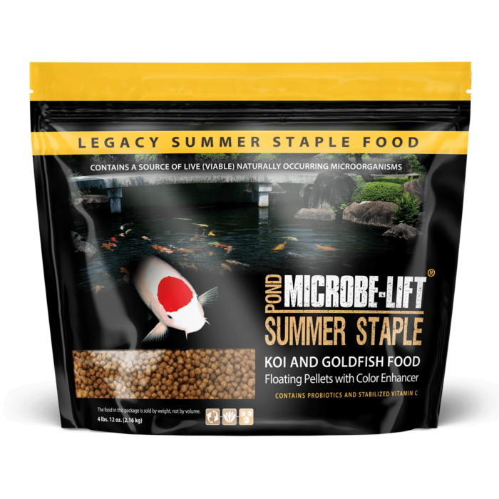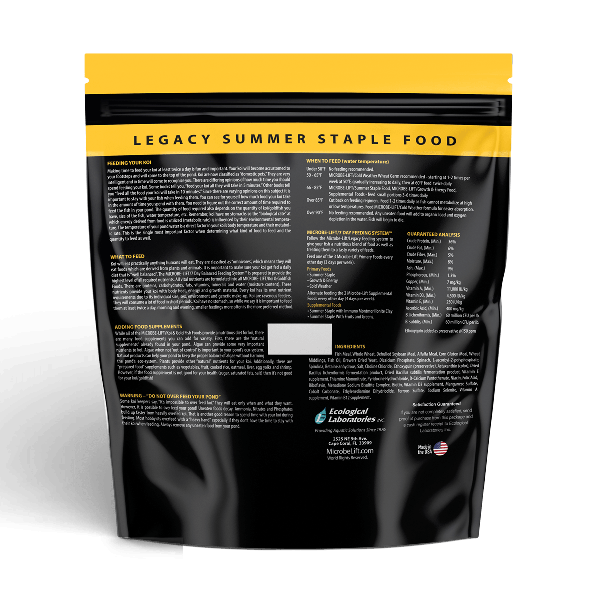 As the warmer weather sets in, begin increasing the frequency and quantity of your feedings. MICROBE-LIFT/LEGACY Summer Staple Food has animal protein and color enhancers that are needed during this season. The added color enhancers are made up of astaxanthin (crab shell), spirulina and krill-all which promote brilliant color development.