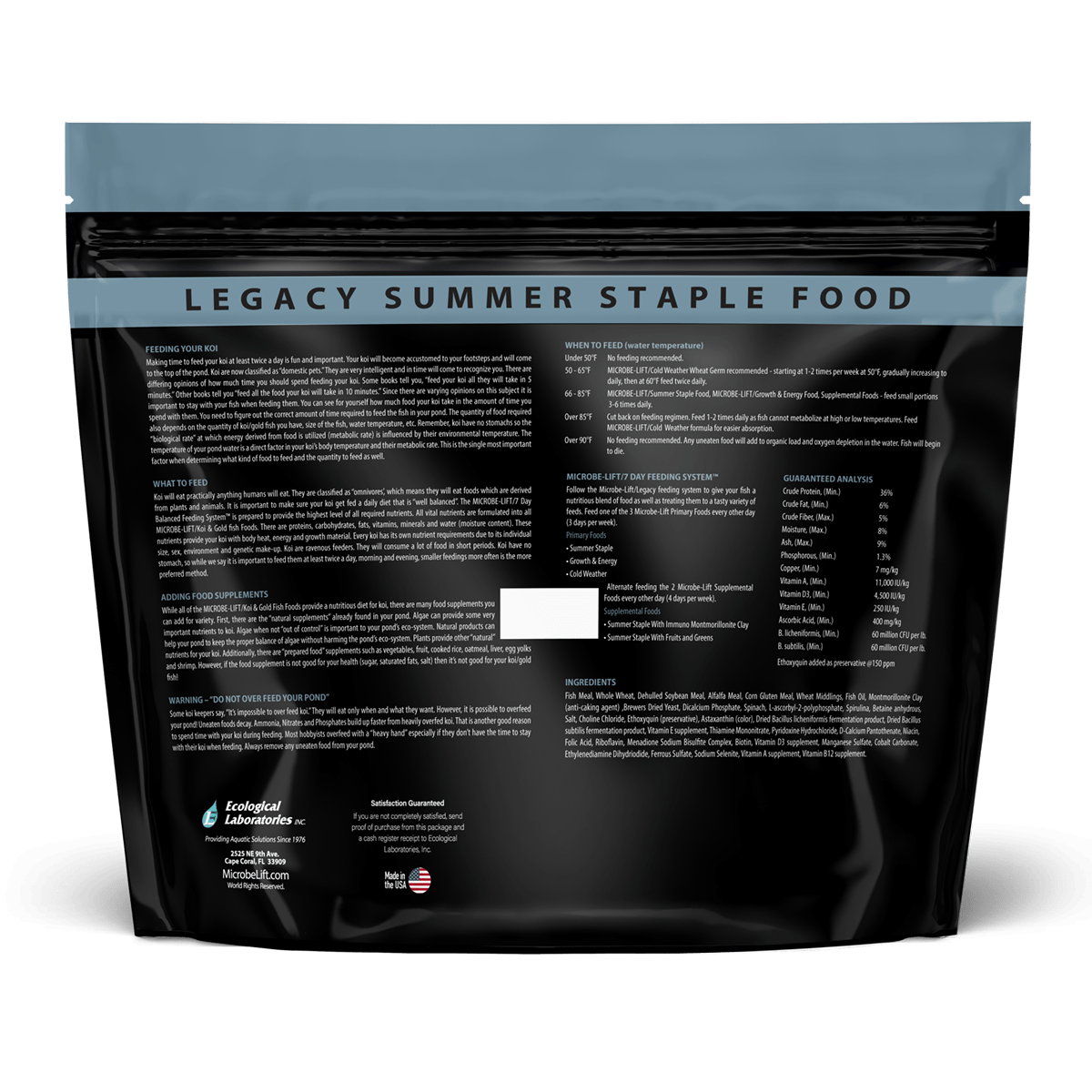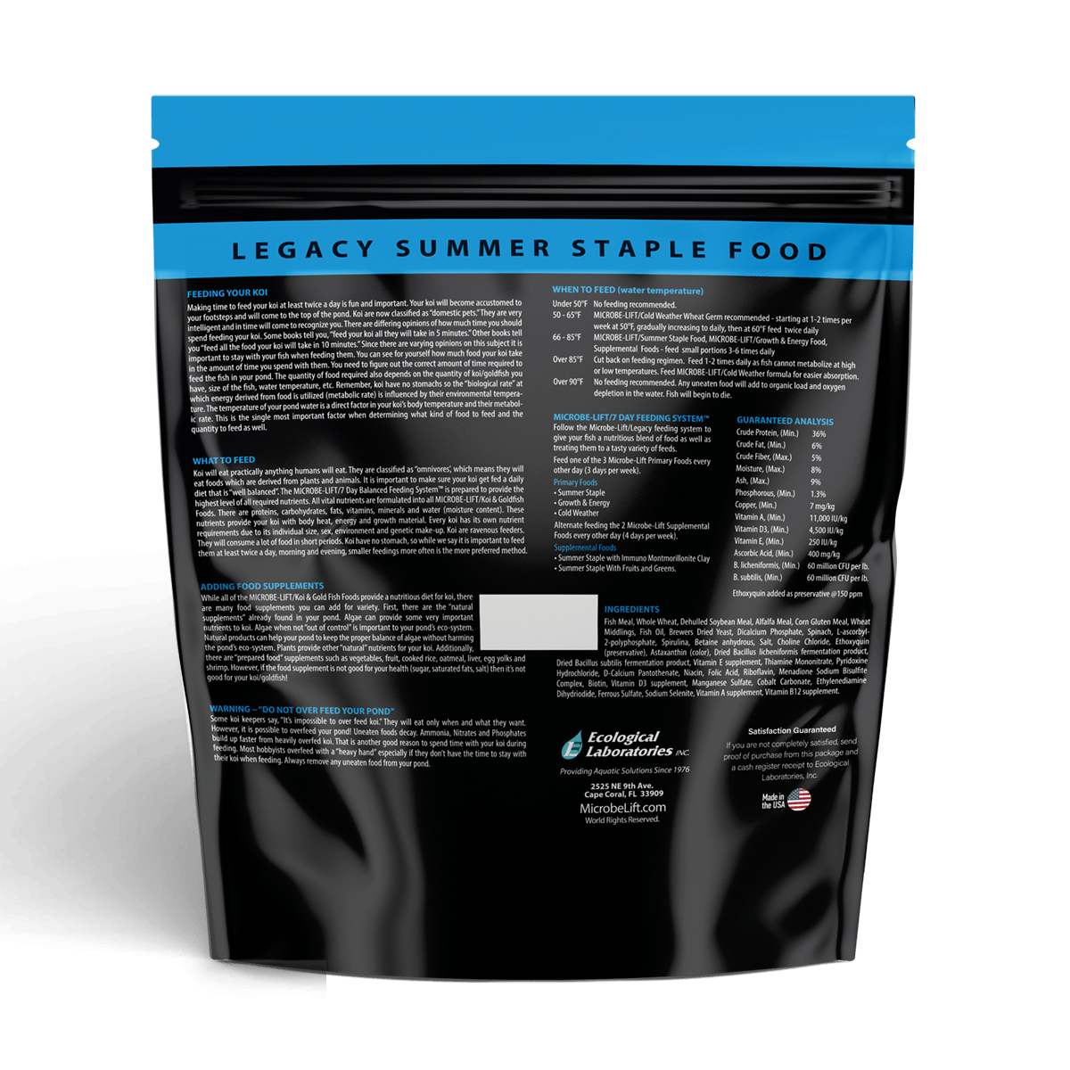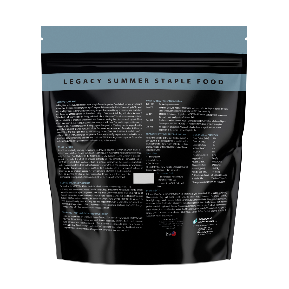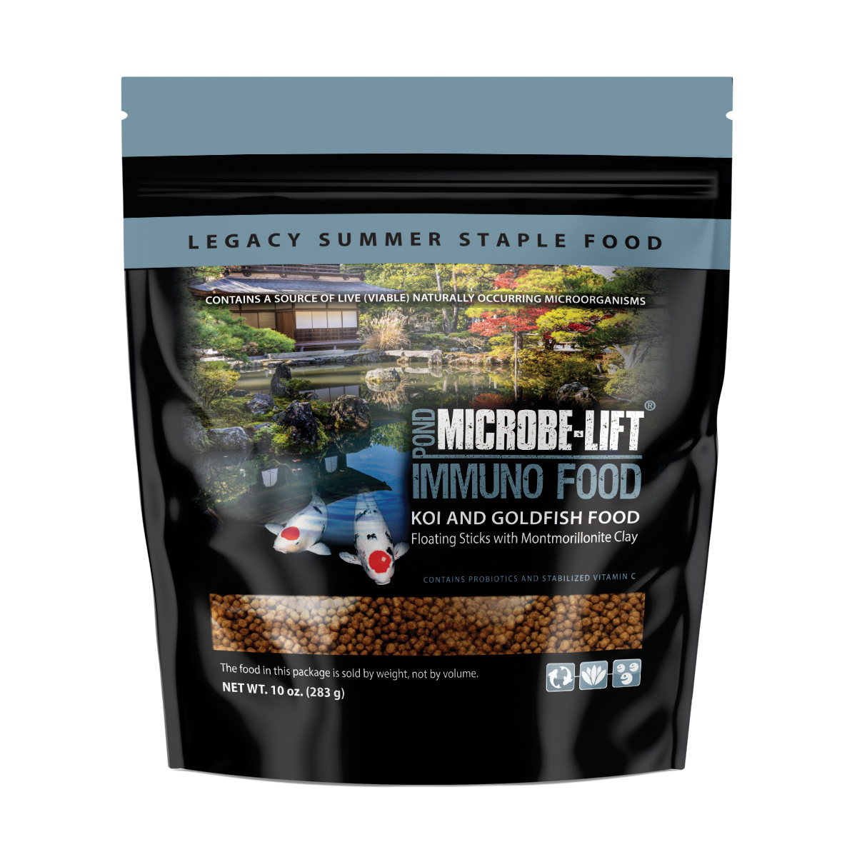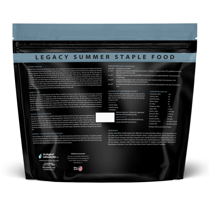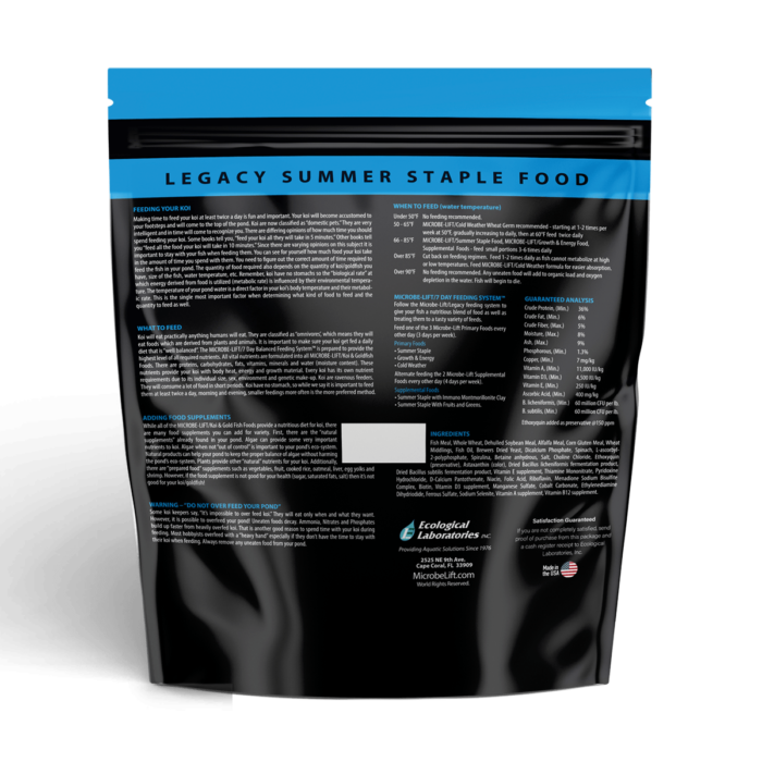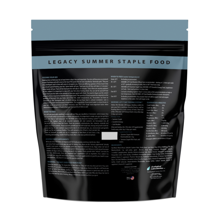Feed your pond fish MICROBE-LIFT/LEGACY Summer Staple With Montmorillonite Clay when temperatures are above 68°F (20°C). Alternate feeding two supplemental foods four days per week. Due to its lower protein content, you can also alternate with MICROBE-LIFT/Legacy Cold Weather Food during colder weather. Montmorillonite Clay provides added minerals, which help stimulate immunity against viruses commonly found in pond environments and also acts as a toxin binder by neutralizing metabolic toxins. Additional quantities of vitamins are also blended into this food.